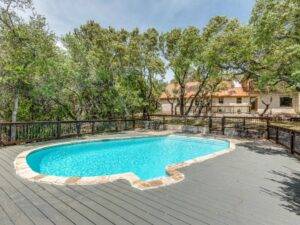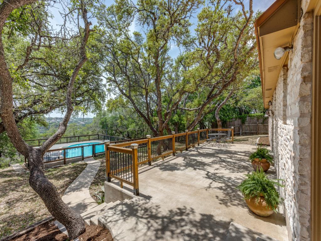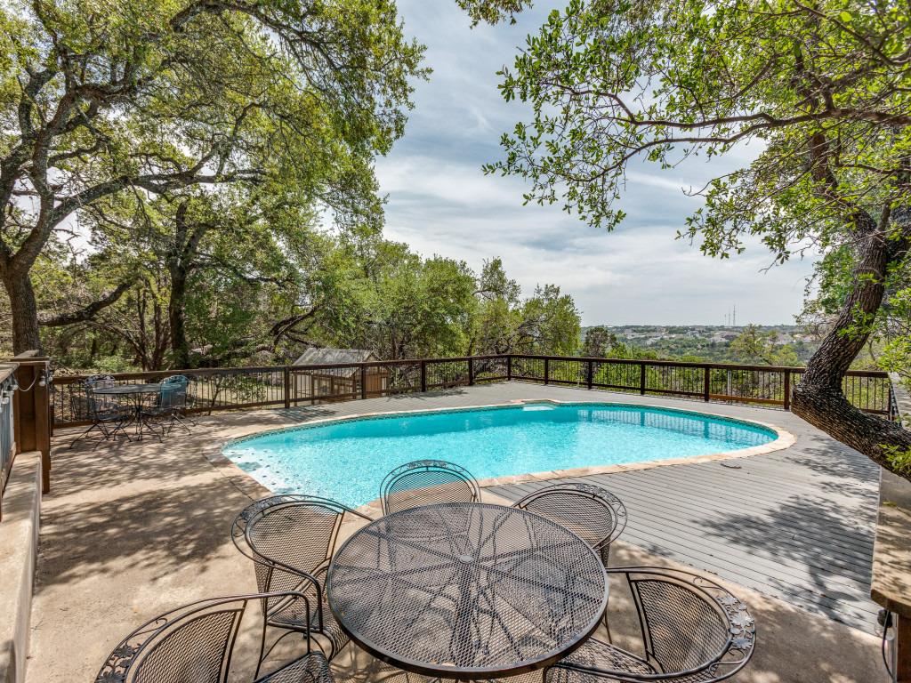 The backyard provides an environment tailored for both quiet reflection and active gatherings. A private pool creates a natural focal point. It invites you to swim on a warm afternoon or simply lounge with a good book as the water reflects the Texas sky. In the evening, the setting shifts effortlessly. Under the stars, this same pool and patio space become a backdrop for entertaining guests or enjoying solitude.Inside, the home offers thoughtful versatility. Two primary suites, one on each level, give flexibility for multi-level living. Both suites overlook the backyard and pool, offering tranquil views that remind you of why Hill Country living is so sought after. This design not only works for owners who want private retreats but also for those who regularly host guests and want everyone to feel comfortable.