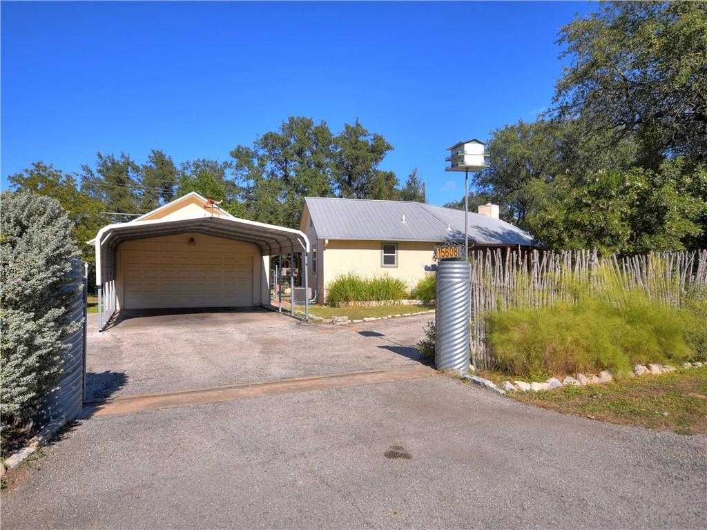 15608 Enid Dr, Austin, Texas 78734 - this special home is nestled on three lots on a parklike setting near the famous Lake Travis. It has been well maintained over the years with additions of double paned windows, tankless water heater, and metal roof. The large garage is perfect to set up a workshop, while the carport provides parking for your utility vehicle. It has an open floor plan with walls of windows and doors leading to covered porches on the front and back of the house. It's perfect for entertaining and has large towering trees and beautiful landscaping as its grasses and firecracker plants rustle in the winds. It's gated on both ends of its semicircular driveway. Granite counters in the master bath with an oversized walk-in shower. The kitchen has silestone counters and custom cabinetry. There is a perfect sunny location for your garden. It is definitely a home sweet home.