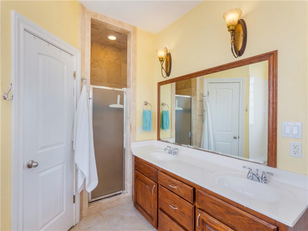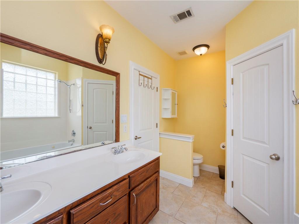 The owner’s retreat at 221 Twisted Creek, Kyle, Texas 78640 is designed to be more than a bedroom—it’s a private haven. A jetted tub invites relaxation after a long day, complemented by a separate shower and dual vanity. The walk-in closet offers more than enough room for clothing, shoes, and accessories, giving the space a true sense of luxury. Every detail has been carefully considered to make your day-to-day life easier and more enjoyable.