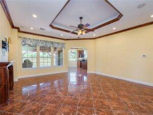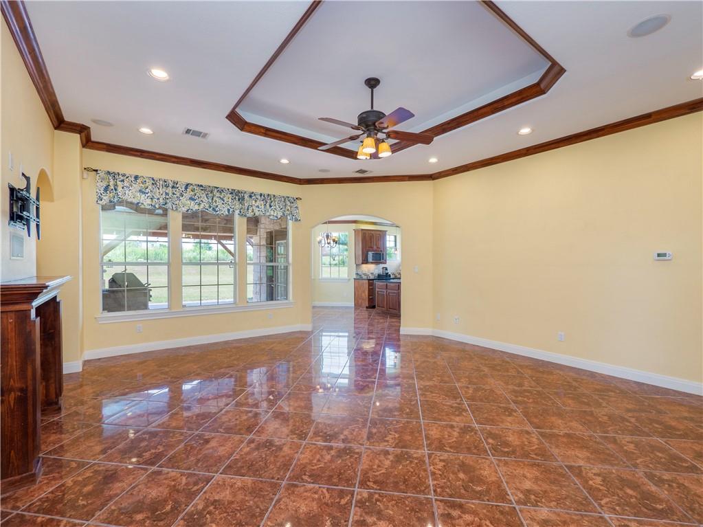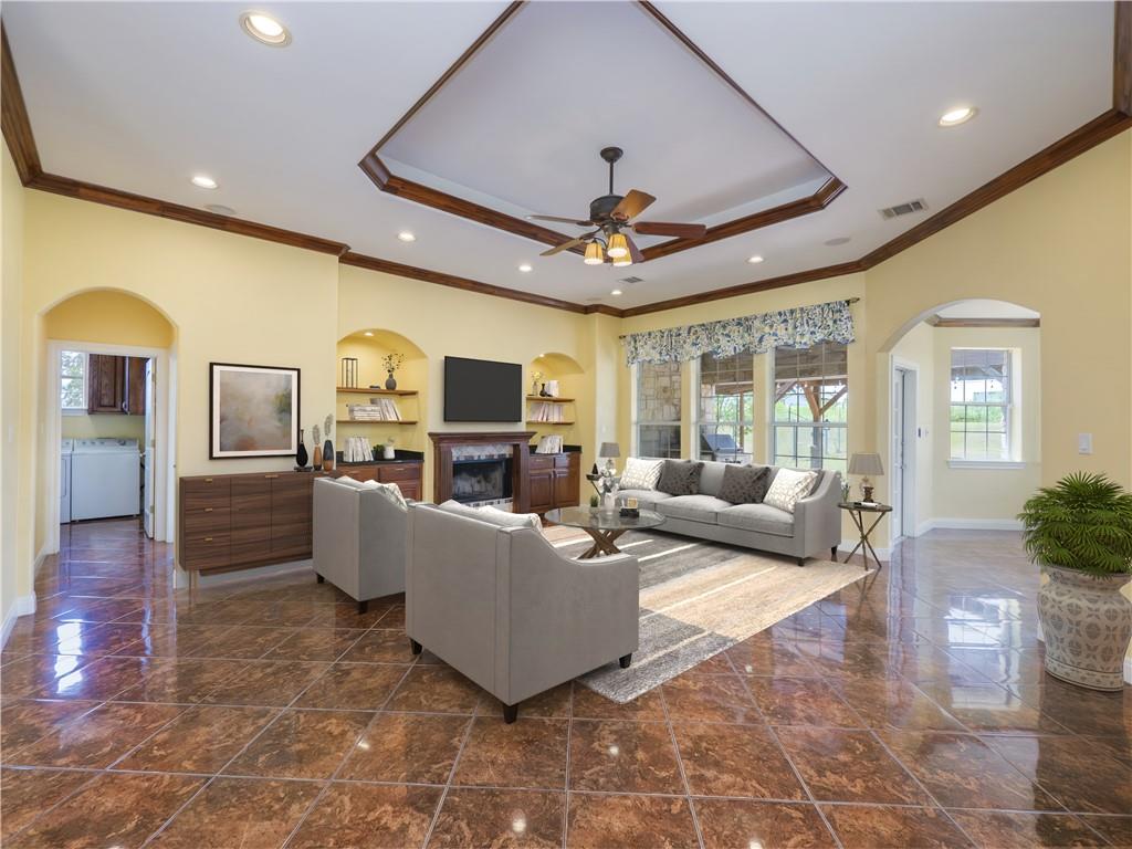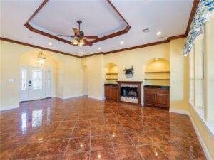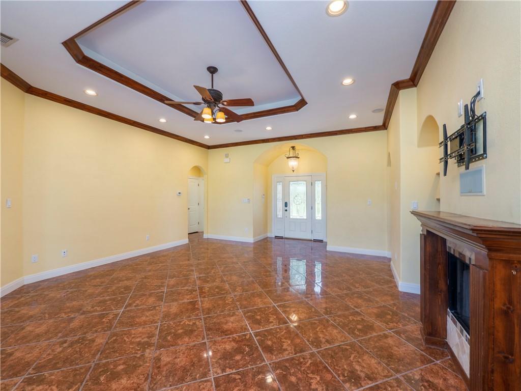Step through the Texas-style front door, and you’re immediately greeted by a spacious living room that exudes elegance and warmth. The coffered ceiling and crown molding create a sense of sophistication without sacrificing comfort. Tile floors run throughout the main living areas, providing durability and a polished finish, while the gas starter fireplace adds a cozy, welcoming atmosphere during cooler evenings.