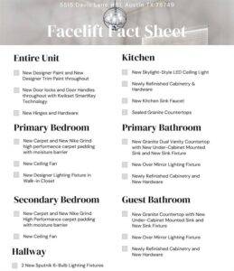 5515 Davis Ln #51, Austin, Texas 78749 Escape the Texas heat and pollen with this inviting condo, where you can relish the cool comfort of indoor living without the hassle of maintaining an unused outdoor space. Say goodbye to the chore of shopping for patio furniture and hello to carefree relaxation indoors. This spacious 1,310 est square feet condo has 2 large bedrooms, and 2 full bathrooms and is set inside the beautiful Beckett Place where the grounds are meticulously maintained. Fully renovated unit. New carpeting underfoot even with Nike padding, refinished cabinets throughout, and fresh designer paint throughout create a fresh and welcoming atmosphere. The primary suite features a large walk-in closet with designer lighting and a large ensuite primary bath with a separate shower and jetted tub. The double vanities feature new granite and new lighting. The kitchen features luxury granite countertops, skylight-style and canned lighting, a large pantry, and a gas stove. The new kitchen faucet has a light that comes on, assisting you with the direction of the water flow. New locks, new carpeting, new hinges, new chandelier, and ceiling fans, professionally painted throughout, refinished cabinets and new cabinetry hardware throughout, new lighting fixtures, new granite in the bathrooms, the tile floors have been professionally cleaned, and even the kitchen granite has been freshly resealed. You will love the large garage that gives you extra room to exit your vehicle(s). Don't let this opportunity slip away. There is not another unit in the complex that has been finished and appointed as thoughtfully updated as this one.